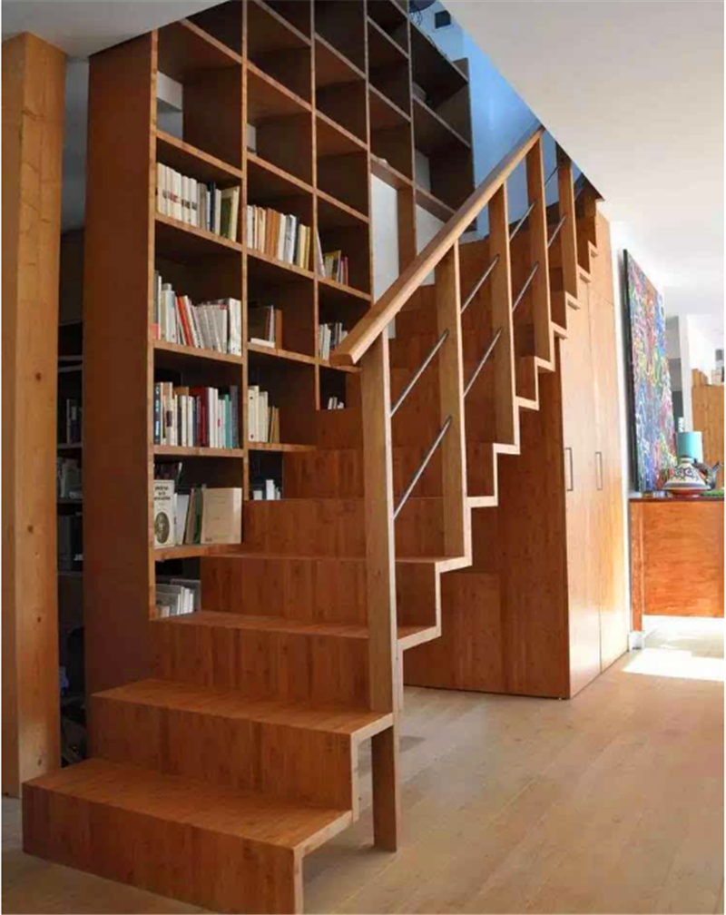 3、把樓梯墻壁打空,安置上嵌入型的書架,輕奢的氣質盡顯。