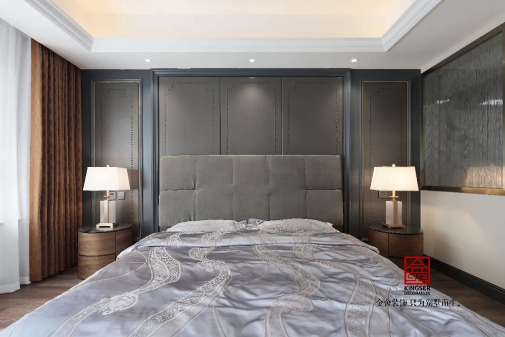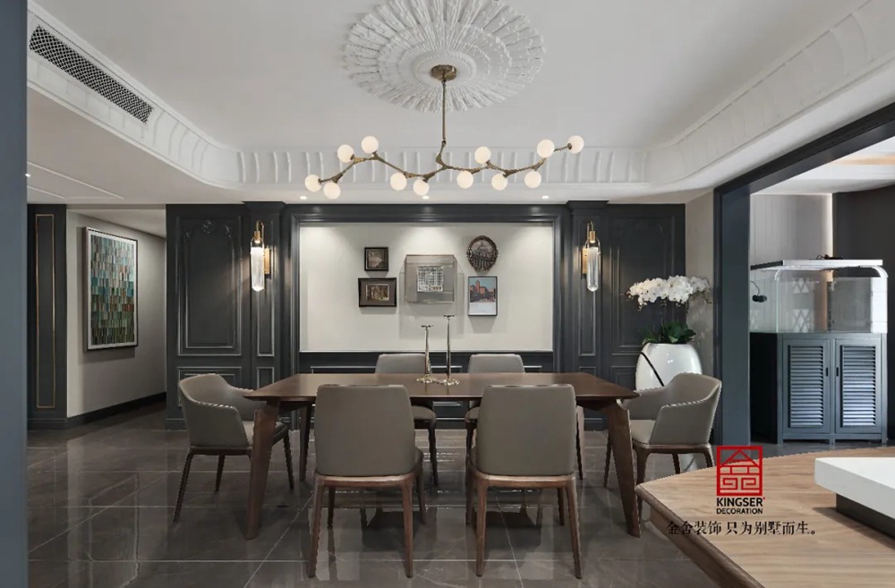 此案例為石家莊金舍裝飾-御河上院220平米新古典風格裝修實景。 新古典風格從簡單到繁雜、從整體到局部,精雕細琢、鑲花刻金都給人們留下一絲不茍的印象。它一方面保留了材質、色彩的精致風格,可以很強烈地感受到悠久的歷史痕跡與渾厚的文化底蘊,同時又摒棄了過于復雜的肌理和裝飾,簡化了線條。