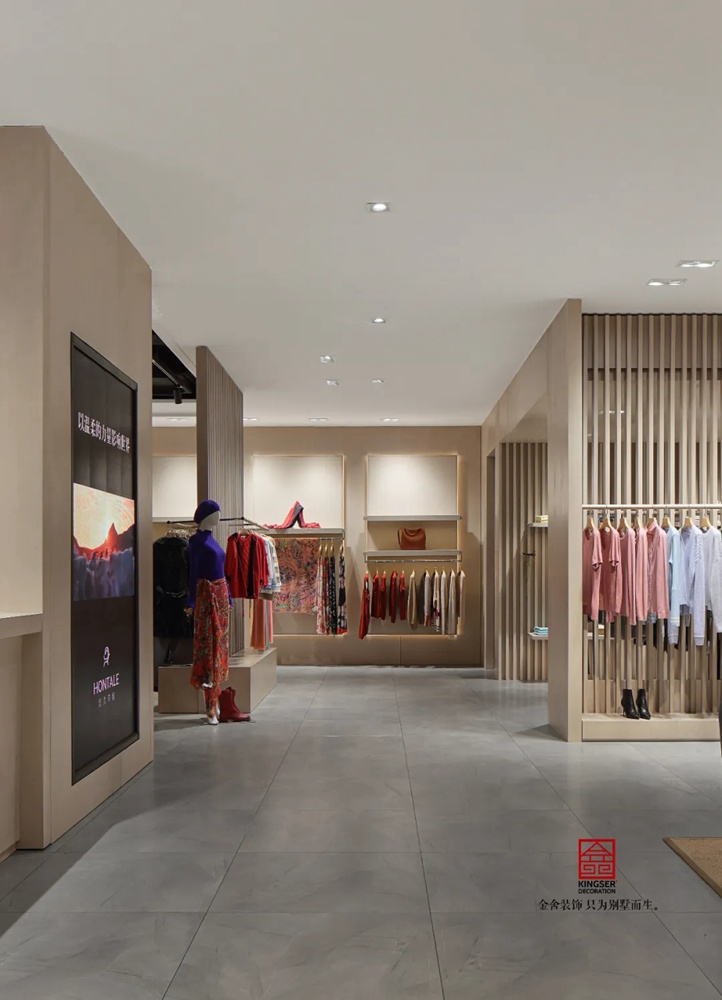 在該案的設(shè)計上設(shè)計師深諳整體與局部,線條與燈光,色彩與配飾之間的關(guān)系,把握整體而不忽視局部,突出線條而不削弱燈光,彰顯原木色彩而不漏掉配飾,匠心獨運打造出一個讓人心馳神往的購物天堂