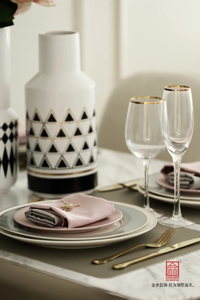 餐桌上配有輕奢風格的花瓶和餐具,提升房間的華麗氣質,讓空間不再單調。白色與橘紅配色的餐邊椅也讓整個空間看起來更具時尚的溫度。