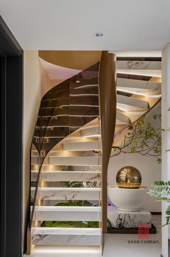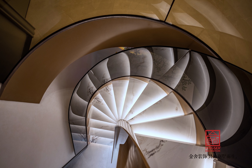螺旋線條復刻鸚鵡螺自然韻律,金屬扶手勾勒利落光影,石材踏板沉淀溫潤質感。剛柔碰撞間,讓樓梯不止是通行空間,更成為家居里自帶焦點的藝術裝置。