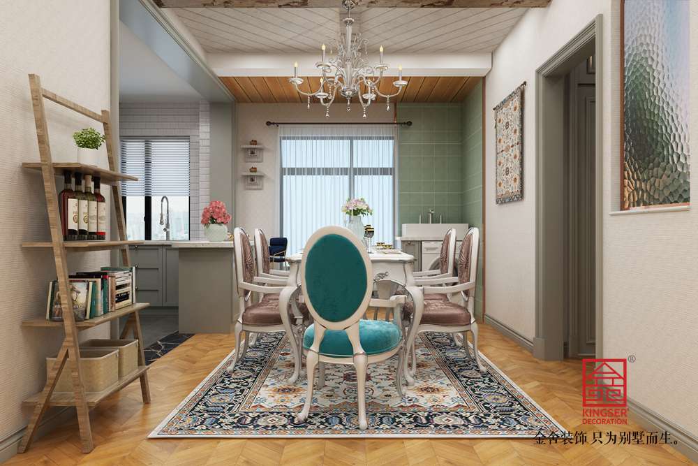 設計說明:此案例為石家莊金舍裝飾-東南智匯城126平米法式輕奢風格裝修效果圖。藍色系具有立體感的沙發顏色,使墻面很顯層次感;多彩的地毯、靈動設計的臺燈、不拘一格的掛畫,營造出一幅自由、溫馨、浪漫的氛圍;而客廳旁的落地窗給足了這間空間明亮的自然采光,用餐區域餐桌上方的水晶吊燈與客廳中的精致吊燈遙相呼應,讓整個空間之中都映射出一種浪漫氛圍,法式風格如同法國這個國家一樣,浪漫迷人,仿佛普羅旺斯的陽光,灑滿你的家。藍色調營造浪漫時尚法式風情,尋求心靈的自然回歸感;將法式傳統的三顏色與當季流行色融合,不失法式的貴氣和浪漫