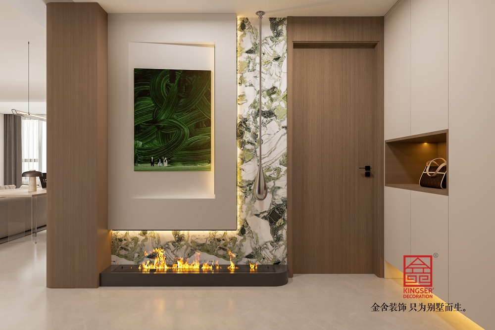 本客廳設計以現代簡約風格為核心,主打溫暖柔和的大地色系。空間布局上,將休閑與功能區巧妙融合,背景墻處的柜體設計,兼具收納與展示功能,燈光點綴更顯精致。家具選擇注重舒適與質感,淺米色大沙發搭配棕色系單品,營造出溫馨和諧的氛圍。雙層環形吊燈造型別致,為空間增添時尚感。整體通過材質、色彩與燈光的搭配,打造出一個舒適、雅致且充滿生活氣息的別墅起居空間。