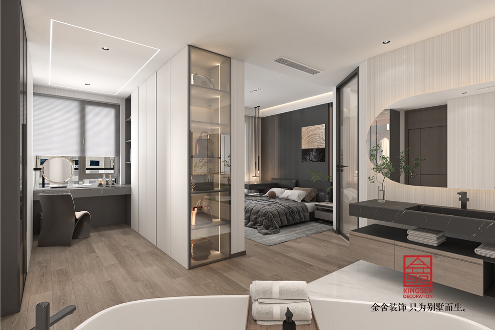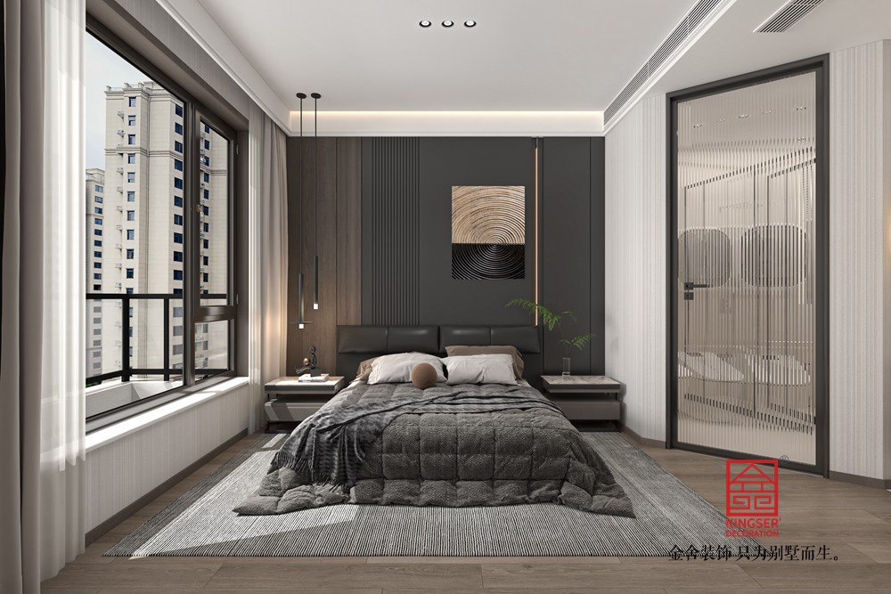 主色調(diào)以淺米色墻面為基底,搭配原木色地板與深灰色家具,形成低飽和度的和諧配色,既顯干凈清爽,又能適配多種軟裝風(fēng)格。