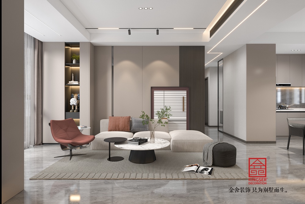 家具選擇上,淺米色沙發(fā)柔軟舒適,搭配色彩點(diǎn)綴的靠枕,增添活力;紅色單人椅造型獨(dú)特,成為視覺焦點(diǎn)。圓形大理石茶幾精致大氣,與小邊幾組合,滿足實(shí)用與美觀需求。